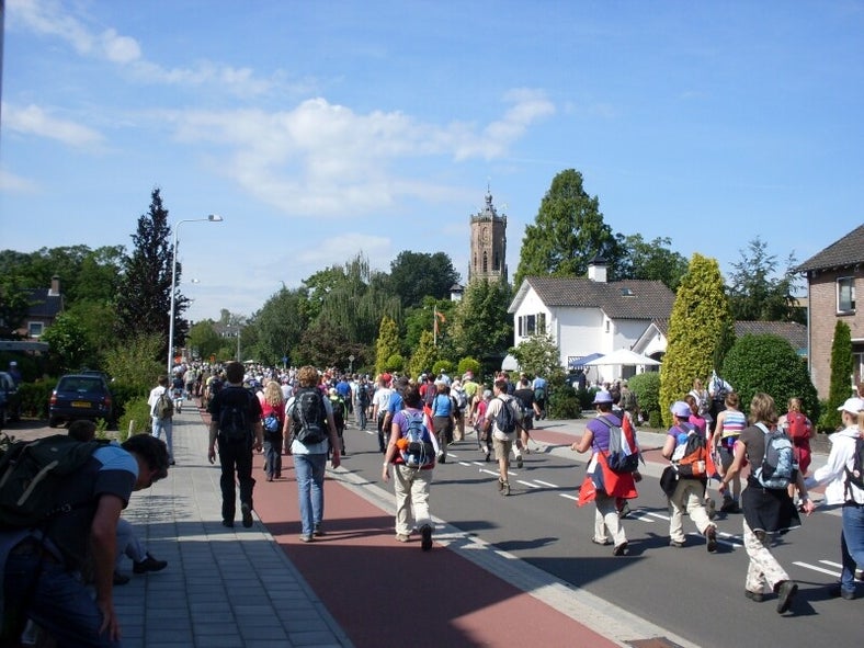 Mijn buurman gaat gewoon van start, en blijkt vrij probleemloos de dag door te komen (wel met pijnstillers). Ik heb wel een beetje last van die vervelende enkel maar kan ook goed de dag doorkomen. Hele dag droog warm weer (22 graden), maar aan het eind in Nijmegen een enorme stortbui, kom ik toch doorweekt over de finish. Gelukkig blijven de voeten droog dankzij de Goretex schoenen.