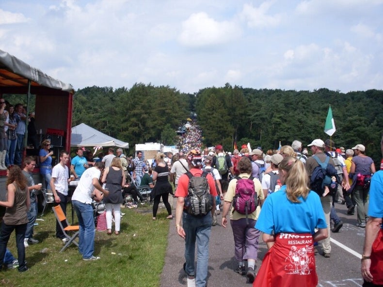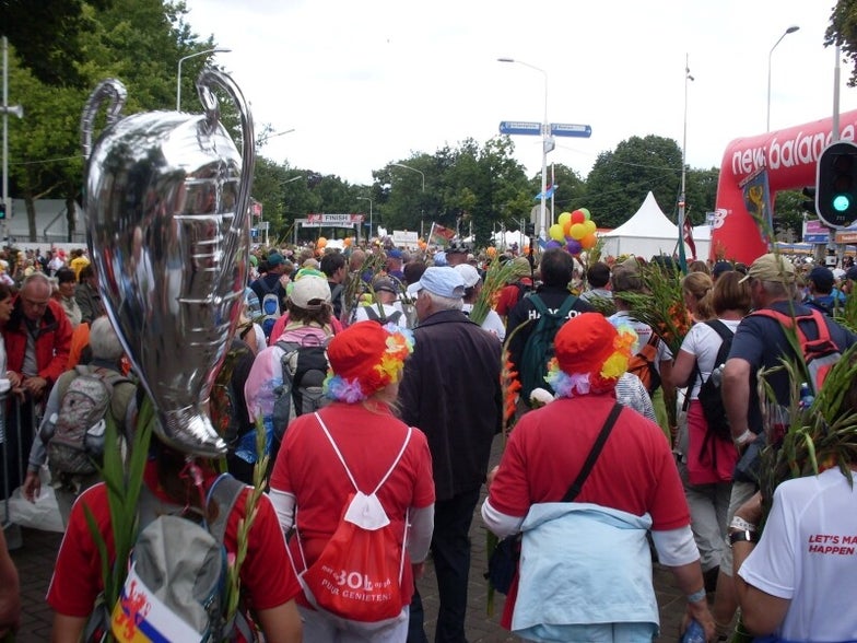 De laatste dag van de vierdaagse met de intocht over de Via Gladiola. Als je eenmaal zover bent gekomen, moet er wel iets heel bijzonders gebeuren om het niet te halen. Deze dag moet ik behoorlijk afzien. Omdat het de laatste dag is ben je gefocussed op het halen van de finish. Hierdoor minder aandacht voor voetverzorging en natuurlijk zitten er al drie lange wandeldagen in de benen. Tijdens de wandeling voel ik al meer blaren opkomen en ook de enkelblessure laat weten dat ie er nog is... Maar met pijnstillers komen we toch vooruit.
